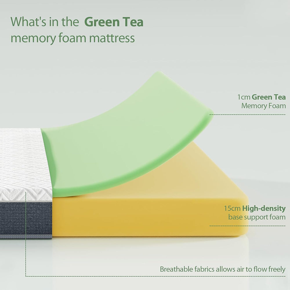 The Mattress is a premium quality, Green Tea Memory Foam Mattress that guarantees an incredible cool and comfortable sleep. Designed with the latest technology and materials, this mattress provides exceptional pressure relief and support. With a medium-firm feel, it is suitable for side sleepers up to 230 pounds and back and stomach sleepers under 130 pounds.